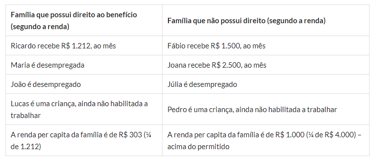 Para facilitar o entendimento, usamos dois exemplos hipotéticos, um de uma família habilitada a receber, conforme o critério de renda, e outra que não.