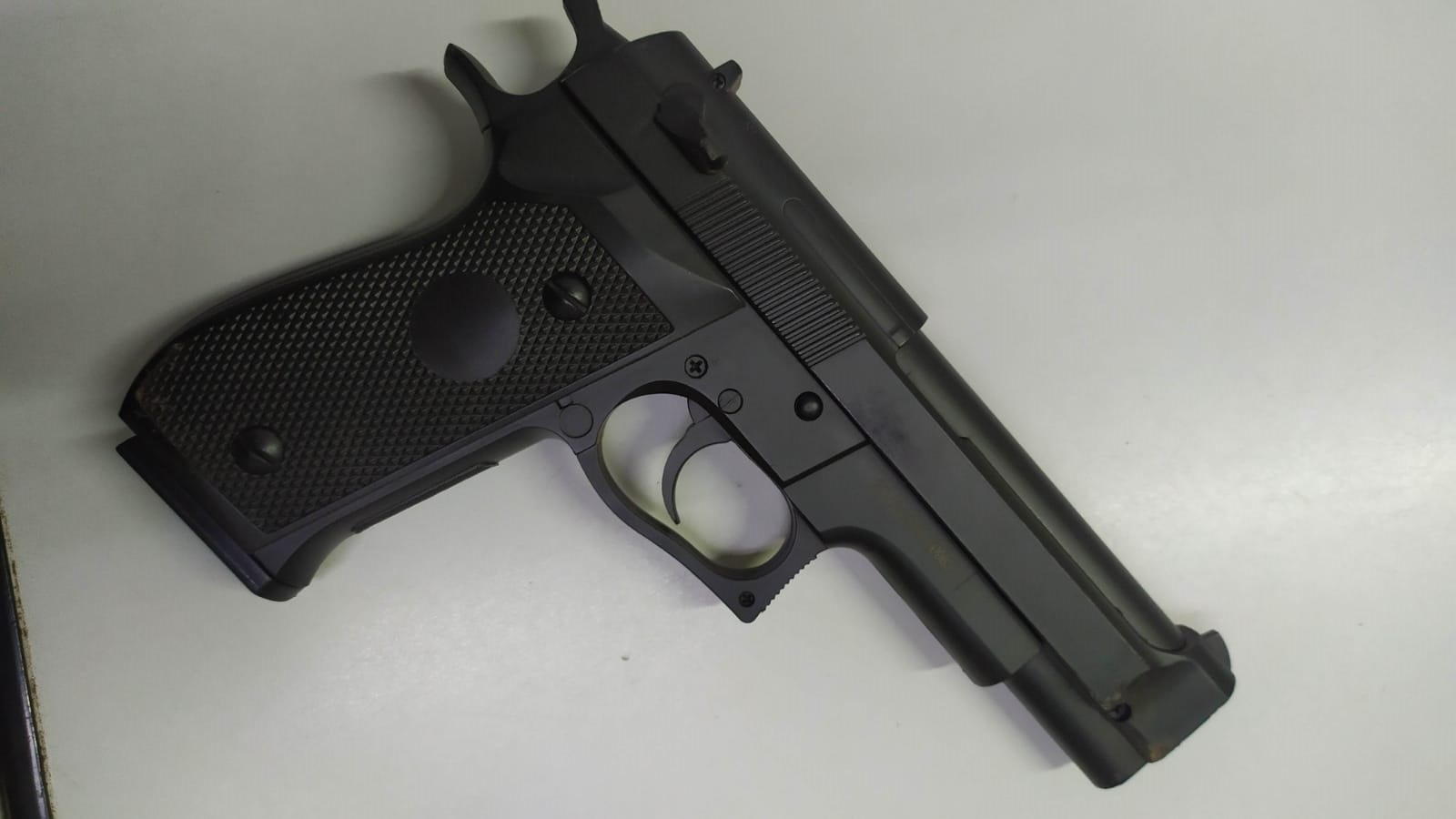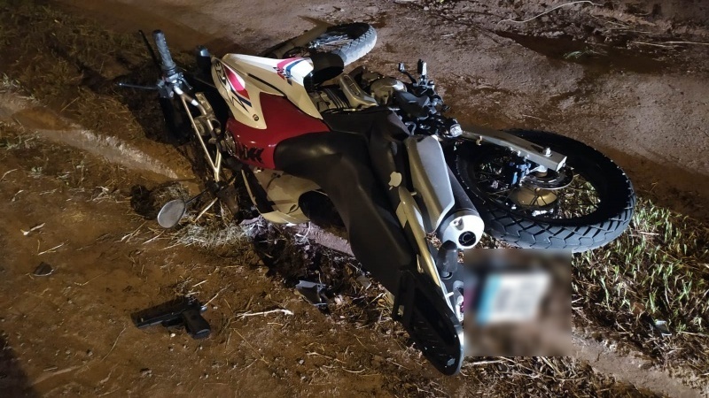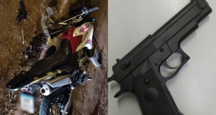 Ao se aproximarem para verem o que estava acontecendo, encontraram um simulacro de arma de fogo ao lado da moto, e foram informados por populares, que pouco antes da chegada da equipe, um rapaz havia perdido o controle do veículo ao bater na sargeta. Logo após, ele subiu na garupa de uma outra motocicleta e fugiu do local.