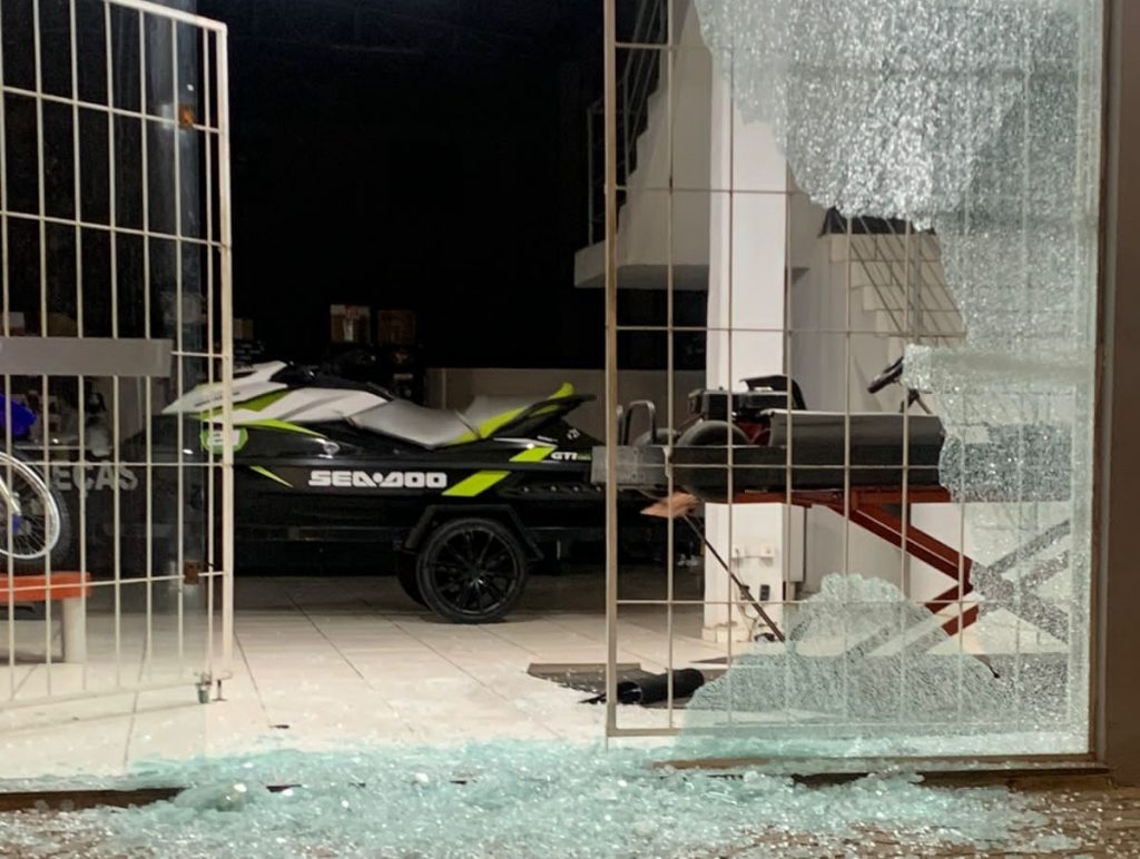 Grupo quebrou porta vidro e arrebentou a grade de proteção para acessar salão da loja, na madrugada desta segunda-feira (12).