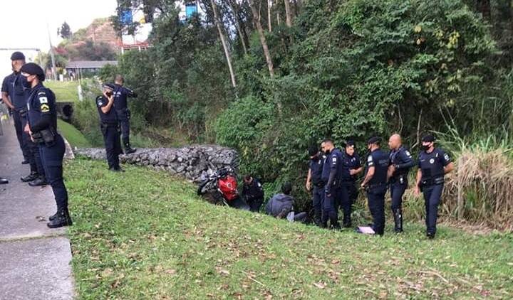 De acordo com informações, pelo km-33, o garupa arremessou uma mochila, que foi recuperada por um dos integrantes da equipe. Pelo km-36, próximo a base da Polícia Militar Rodoviária os meliantes perderam o controle da motocicleta e colidiram contra uma mureta de proteção, no acostamento, sendo arremessados em uma galeria de águas pluviais e detidos posteriormente.