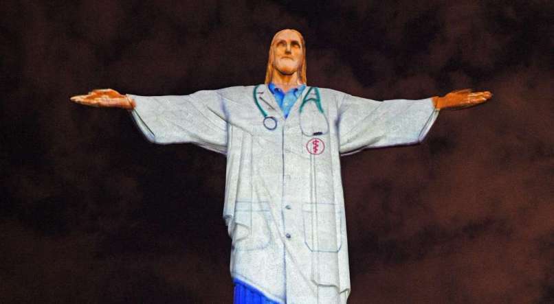 O Cristo Redentor se “vestiu” de médico neste domingo (12) de Páscoa em homenagem aos profissionais de Saúde, em meio à pandemia do coronavírus. Um jaleco foi projetado na estátua.
