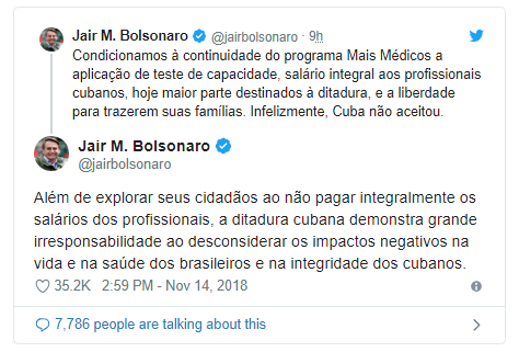 Bolsonaro disse ainda que “além de explorar seus cidadãos ao não pagar integralmente os salários dos profissionais, a ditadura cubana demonstra grande irresponsabilidade ao desconsiderar os impactos negativos na vida e na saúde dos brasileiros e na integridade dos cubanos”. O presidente eleito acrescentou que “Cuba fica com a maior parte do salário dos médicos cubanos e restringe a liberdade desses profissionais e de seus familiares”.
