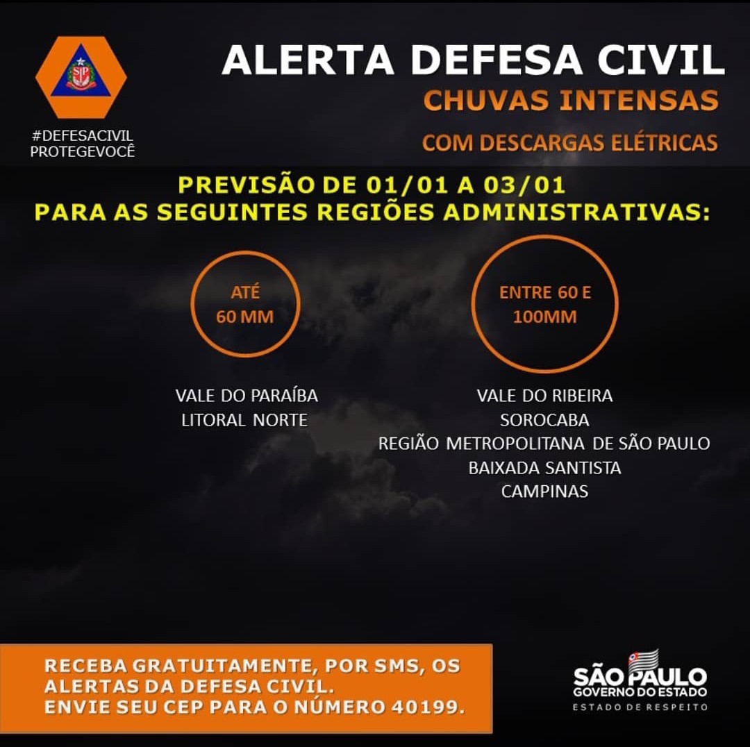 A Defesa Civil do Estado de São Paulo alerta para a previsão de chuvas fortes, com ventos e raios, na faixa leste do Estado de São Paulo, que compreende as