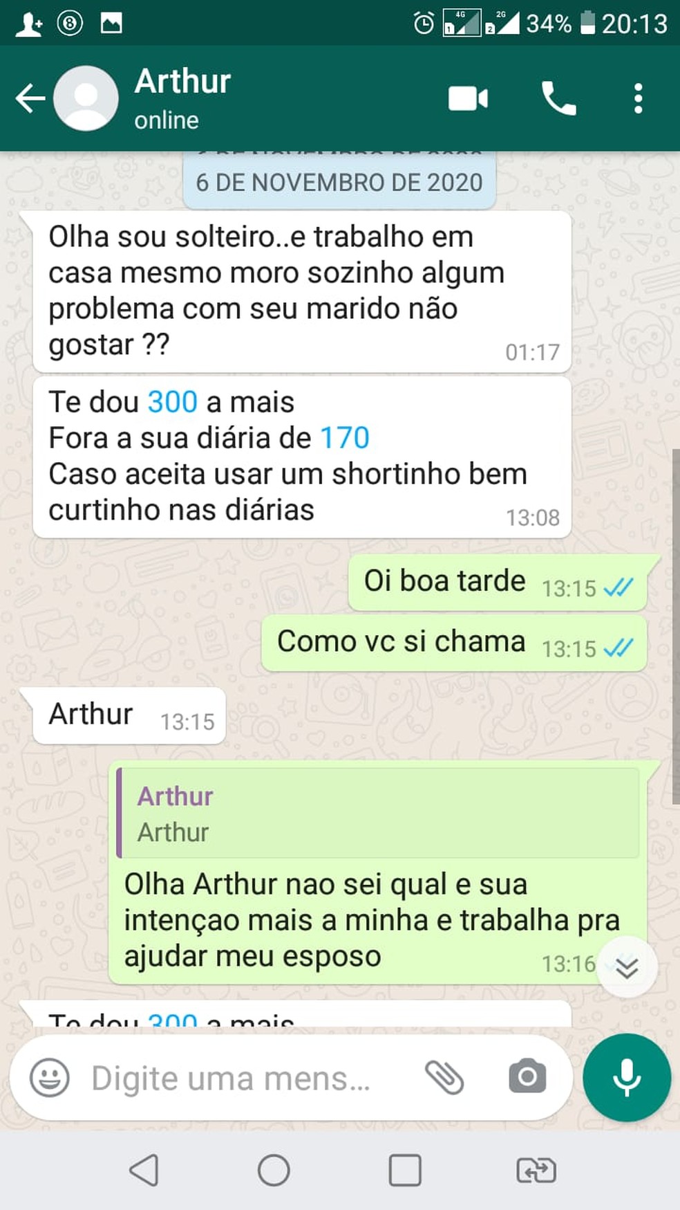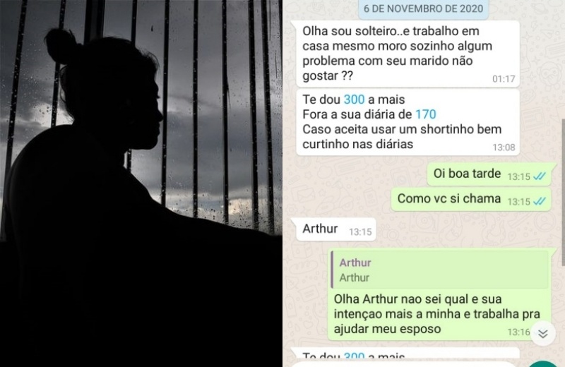 “Mas aí conversando, ele disse que se eu usasse short curtinho, ele pagava mais R$ 300. Eu achei bem constrangedor. Mostrei pro meu marido e ele ficou louco de raiva, indignado”, diz a diarista.