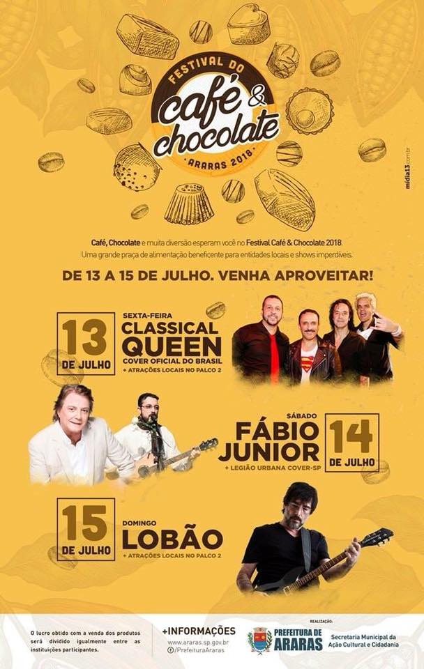 Segundo a programação, as atrações do Festival começam às 19h30 na sexta (13), e a partir das 20h30 no sábado (14) e no domingo (15). Em 2017, o Café & Chocolate arrecadou R$ 283.334,8, com uma despesa de R$ 162.235,31. O montante que sobrou, R$ 121.099,50, foi dividido em partes iguais às 17 entidades participantes. Mais informações podem ser obtidas pelos telefones 3541-5763 ou 3542-5807.
