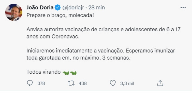 “Prepare o braço, molecada! Anvisa autoriza vacinação de crianças e adolescentes de 6 a 17 anos com Coronavac”, escreveu Doria.
