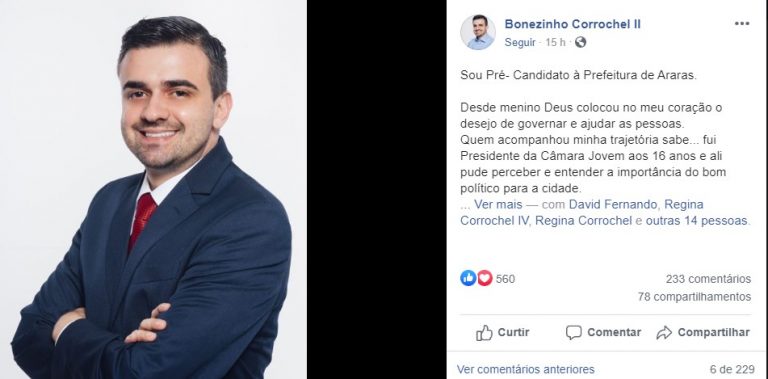 No domingo (09), Mário Corrochel Neto (Bonezinho, PTB), usou suas redes sociais para oficializar sua pré-candidatura a prefeito de Araras (SP). A campanha oficial começa no final do próximo mês e eleições municipais acontecerão em 15 de Novembro.