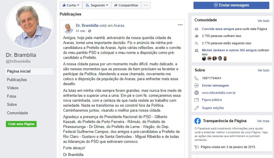 Na manhã deste sábado (15), o médico Dr. Nelson Dimas Brambilla, lançou oficialmente sua pré-candidatura a prefeito da cidade de Araras (SP). Ele que já foi prefeito da cidade, usou sua página no facebook, para comunicar sua decisão. Leia abaixo: