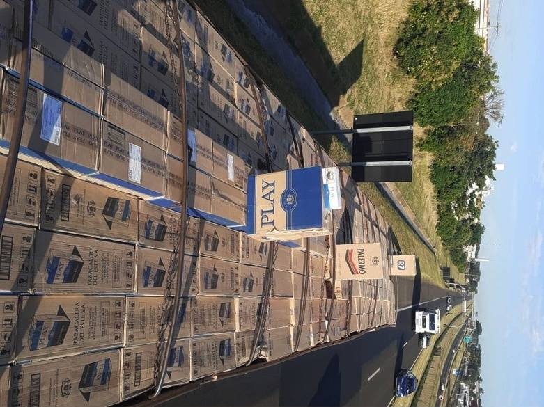 Segundo a polícia, no veículo foram encontradas 600 caixas de cigarros contrabandeados do Paraguai, totalizando cerca de 300 mil maços. Ainda conforme a polícia, o veículo tinha placas clonadas no caminhão-trator e no semirreboque. As placas originais foram apreendidas sob o banco.