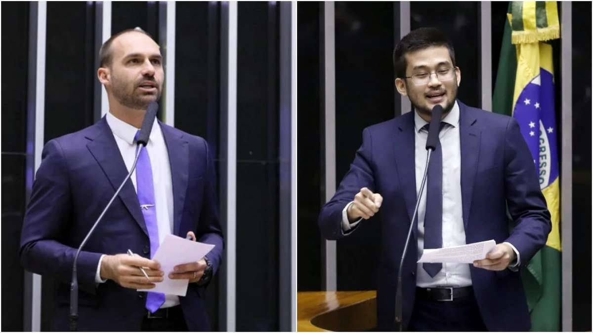 Nesta terça-feira (23), o deputado federal Eduardo Bolsonaro (PSL-SP) disparou críticas contra o deputado federal Kim Kataguiri (DEM-SP) durante uma audiência na Câmara. Eduardo chamou Kataguiri de ‘papel higiênico da esquerda’ ao defender o ministro da Economia, Paulo Guedes.