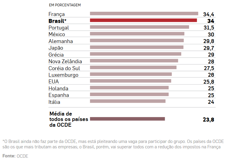 França, que hoje lidera o ranking feito pela OCDE, anunciou uma queda na alíquota de imposto sobre o lucro dos atuais 34,4% para 25% até 2022; no Brasil, taxa é de 34%.