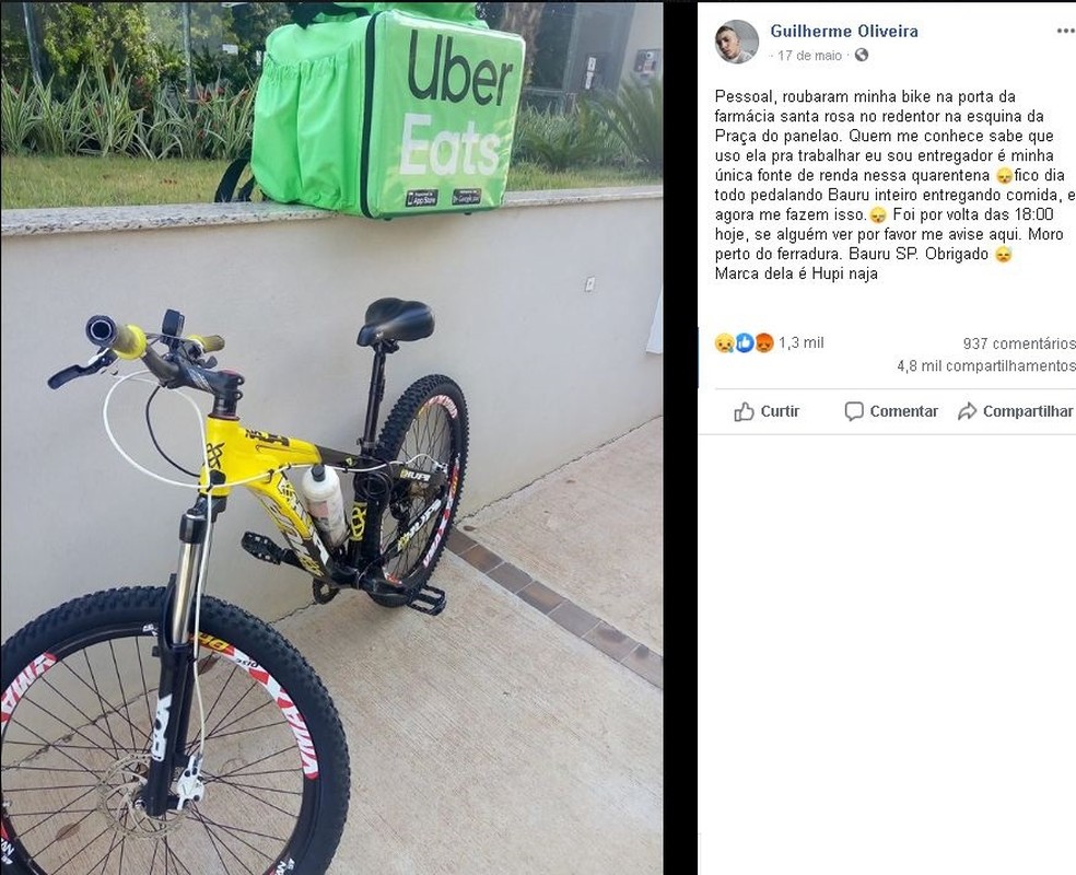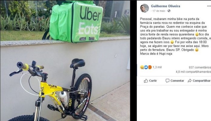 “Quem me conhece sabe que uso ela pra trabalhar eu sou entregador é minha única fonte de renda nessa quarentena. Fico dia todo pedalando Bauru inteiro entregando comida, e agora me fazem isso”, disse na postagem que viralizou na internet.
