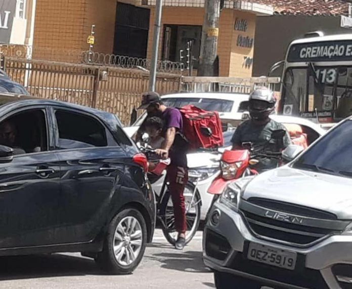 O paraense Alessandro Magno, de 25 anos, está entre os brasileiros que perderam o emprego por causa da pandemia causada pelo novo coronavírus. Como alternativa encontrada para garantir o sustento da família, ele começou a fazer entregas e, sem ter com quem deixar a filha Ana Vitória, de 4 anos, leva a menina na bicicleta para trabalhar nas ruas de Belém, no Pará.