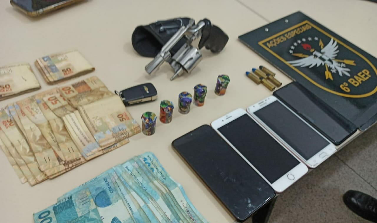 Durante busca pessoal, com um deles foi encontrado um revólver calibre. 38 com 05 (cinco) munições intactas, 03 (três) celulares e uma chave veicular.
