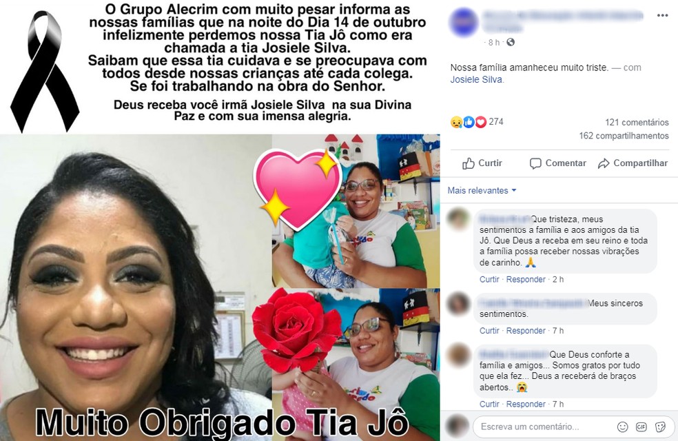 Em um post nas redes sociais, a escola agradece o trabalho de Josiele da Silva. Ele foi baleada na porta de uma igreja.