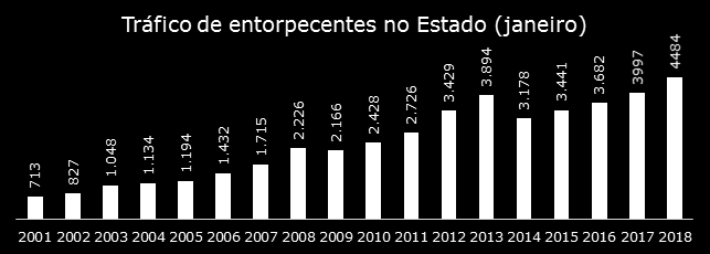 Janeiro também teve alta nos flagrantes de tráfico de entorpecentes: 12,18%. O total subiu de 3.997 para 4.484, chegando ao maior número da série histórica. No primeiro mês do ano, policiais apreenderam no Estado de São Paulo 7,7 toneladas de drogas.
