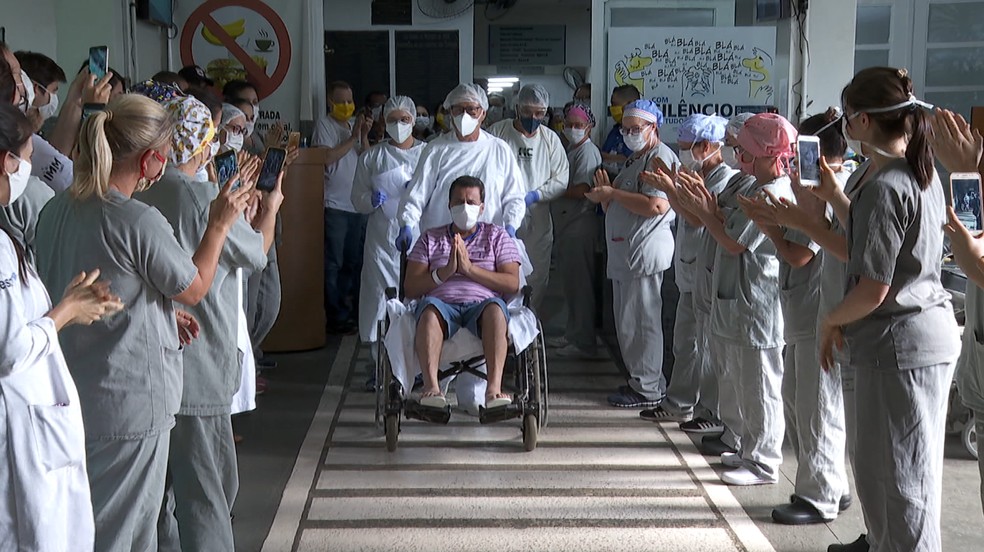 Um homem de 56 anos, curado da Covid-19, atravessou um corredor de aplausos de médicos, enfermeiros e técnicos ao ter alta do Hospital das Clínicas (SP) de Ribeirão Preto (SP) na tarde desta quinta-feira (30).