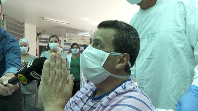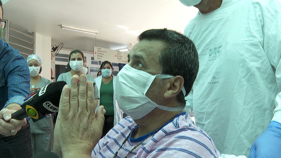 Ao cruzar o portão de saída da Unidade de Emergência do HC, José Beraldo, que é morador de Dumont (SP), ficou emocionado e chorou ao ver os funcionários que trataram dele durante as três semanas em que ficou internado no Centro de Terapia Intensiva (CTI).