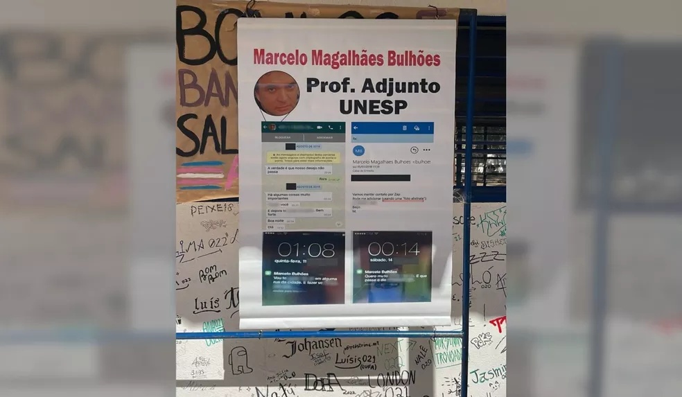 Nos cartazes, expostos no campus nesta sexta-feira (1º), foram colocadas imagens que mostram supostas conversas em rede social de conotação sexual que seriam entre o professor Marcelo Magalhães Bulhões e uma estudante. Ele nega as acusações.