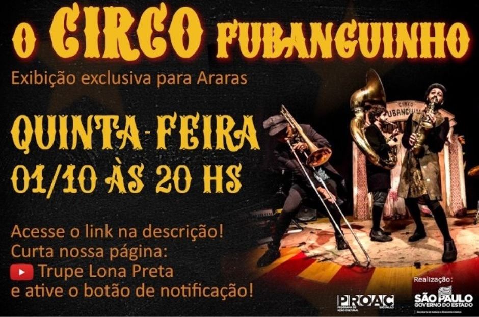 A cidade de Araras (SP) terá uma exibição exclusiva de espetáculo circense on-line nesta quinta-feira (1º de outubro). Com realização do Governo do Estado de São Paulo, por meio do Proac (Programa de Ação Cultural) Editais, a Trupe Lona Preta apresenta “O Circo Fubanguinho” a partir das 20h, no canal da trupe no youtube –https://youtu.be/hMT6m1d8SNY.