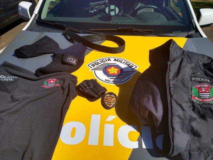 No porta malas, os policiais encontraram duas blusas e uma touca de uso exclusivo da Polícia Civil, com logotipos na frente e costas, além de um distintivo da Polícia Civil e um cinturão com coldre.