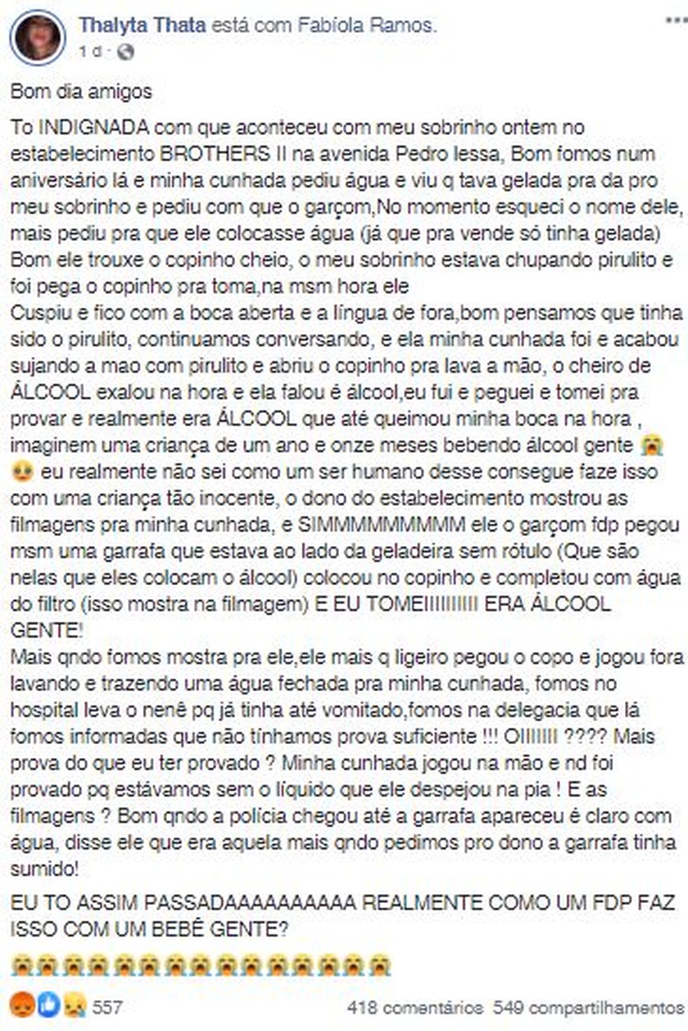 Quando reclamaram, segundo Thalyta, o garçom imediatamente pegou o copo e jogou o conteúdo fora, lavando-o em seguida. Ele trouxe, ainda, uma garrafa de água lacrada para a família. “Não sei como um ser humano consegue fazer isso com uma criança tão inocente”, diz.