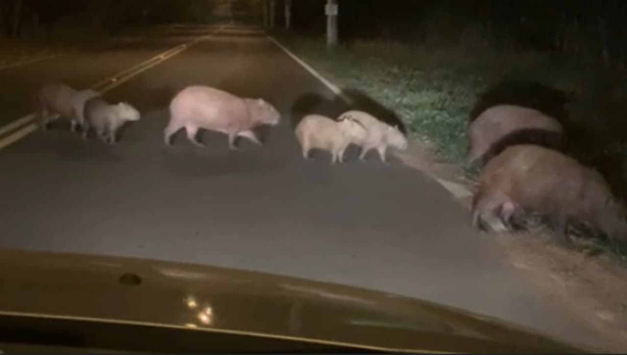 A família era composta de duas capivaras adultas e cinco filhotes e chamou atenção e parou o trânsito no local. Uma delas, de maior porte, foi vista andando tranquilamente pela rua de um lado para o outro.