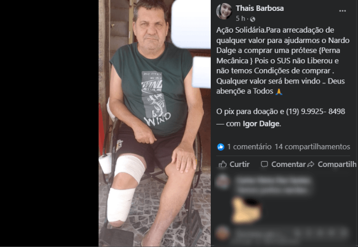Ele precisou amputar uma das pernas, após complicações de saúde por conta do diabetes. De acordo com publicação de seu filho e sua nora através das redes sociais, o SUS (Sistema Único de Saúde), não liberou a prótese e a família está sem condições de comprar. É uma família que eu REPÓRTER BETO RIBEIRO conheço, e que realmente está precisando da nossa ajuda neste momento. Leia a publicação abaixo: