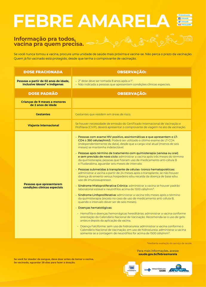 A população de e São Paulo, Rio de Janeiro e Bahia receberá a dose fracionada da vacina de febre amarela. A meta é vacinar 95% de 19,7 milhões. O objetivo é evitar a circulação e expansão do vírus. A dose padrão da vacina continuará sendo administrada em alguns grupos conforme a tabela abaixo.