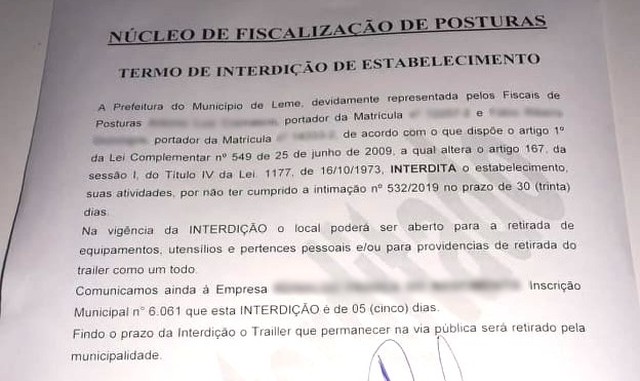 Após vencimento do prazo de 30 dias da intimação, a Prefeitura de Leme (SP) interditou os trailers de lanches e exigiu a retirada dos carrinhos do local onde estão instalados até sexta-feira (25).