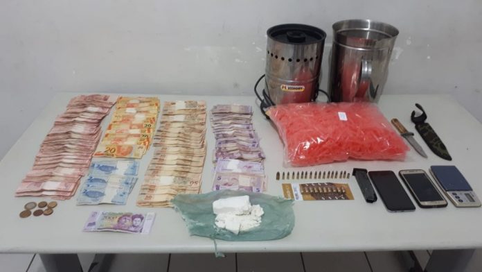 Durante a revista no imóvel, os militares localizaram em cima da mesa da cozinha uma porção de cocaína, balança de precisão, pinos plásticos vazios para embalagem da droga e uma faca. A quantidade de droga não foi informada.