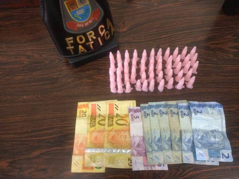 Os mesmos ao perceberam a presença dos “Tatiqueiros”, tentaram dispensar alguma coisa em duas residências, de imediato eles foram abordados, e em revista pessoal com Leandro (maior) foi encontrado um pino de cocaína e $25,00 reais, com Maicon (menor) foram encontrados R$12,00 reais, e na casa mais R$40,00 que foi jogado por Matheus (maior).