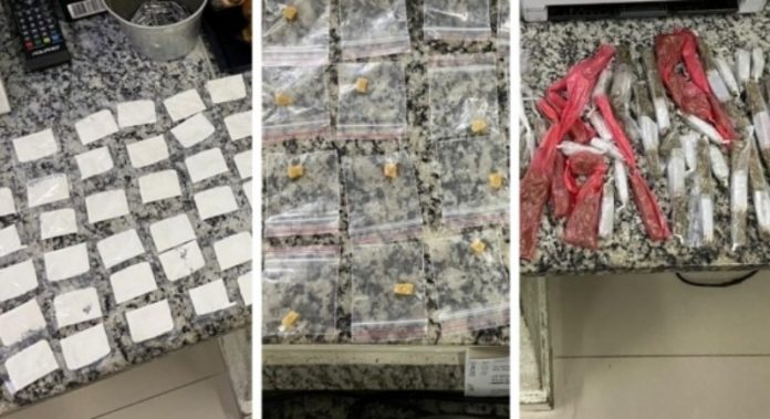 Na busca pessoal, foi localizado dentro de uma pochete 94 trouxas de maconha, 44 pedras de crack, 93 papelotes de cocaína e a quantia de R$ 26,00 Reais oriundo da venda de drogas. A ocorrência foi apresentada no 3° Distrito Policial, ficando o indivíduo à disposição da Justiça.
