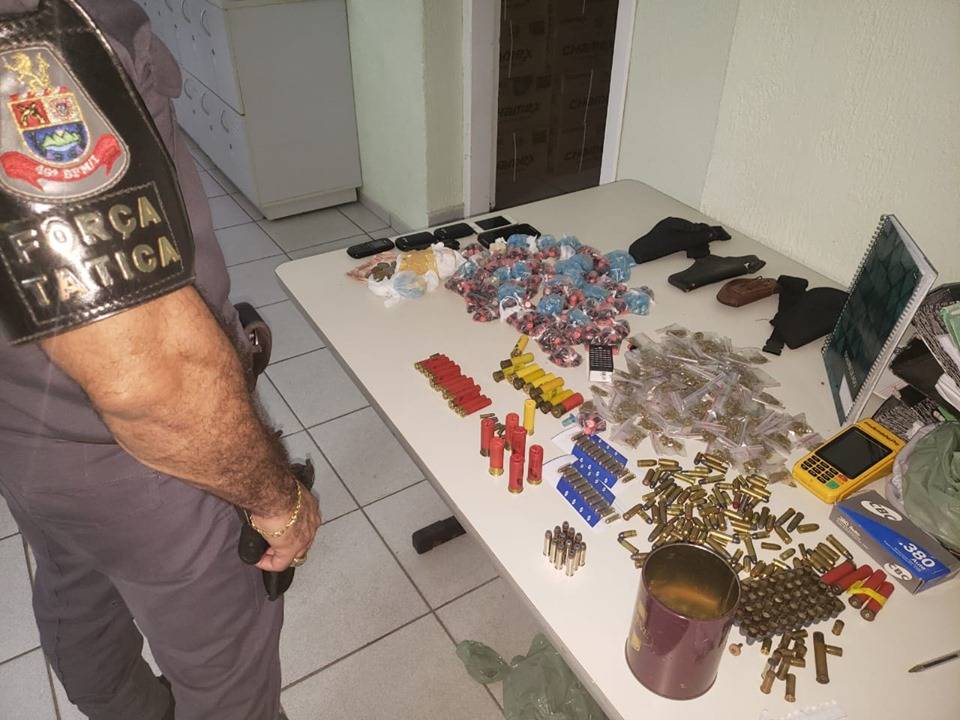 Ao todo, os militares encontraram 175 munições de diversos calibres, incluindo de 380, 38, 40, 7.65, 32, 36, 20, 12, 22, 25 e 357, e mais 605 tubetes cheios de cocaína, 104 porções de maconha e 272 pedras de crack, além de quatro coldres e aparelhos celulares.