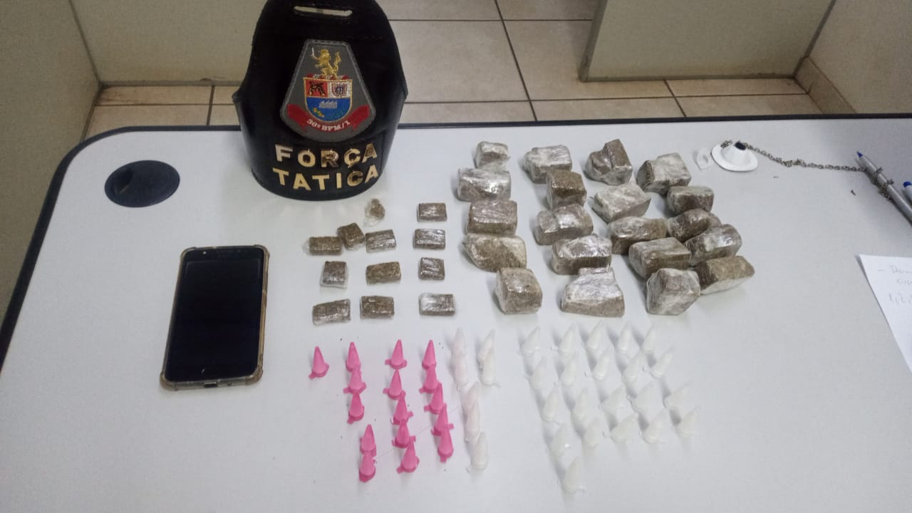 Em busca pessoal foi localizada uma pochete na cor preta em sua cintura contendo uma certa quantidade de entorpecentes e um celular marca motorola. Indagado o mesmo sobre a procedência da droga ele assumiu que estava na prática do tráfico de drogas e informou que na residência ao lado estava alugando e guardava mais drogas no local para o comércio. O portão estava aberto, e os policiais fizeram uma varredura no local informado pelo indiciado sendo localizada mais uma grande quantia de entorpecente.
