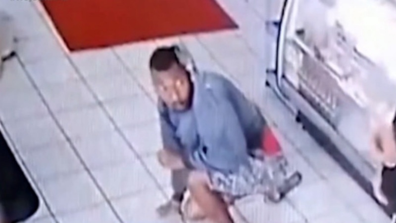 A mulher estava sentada quando o homem, que aparentava ter entrado no estabelecimento para comprar algo, passa a mão no corpo dela. Ele, então, continua andando como se nada tivesse acontecido, mas a mulher o aborda e começa a agredi-lo.