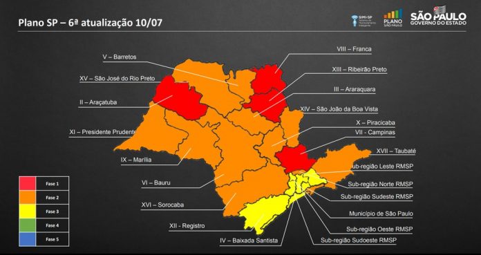 O governo de São Paulo anunciou nesta sexta-feira (10) a prorrogação da quarentena obrigatória no estado até o dia 30 de julho e atualizou a situação das regiões no Plano São Paulo de reabertura gradual das atividades econômicas. Dez regiões avançaram para fases mais permissivas e nenhuma retrocedeu.