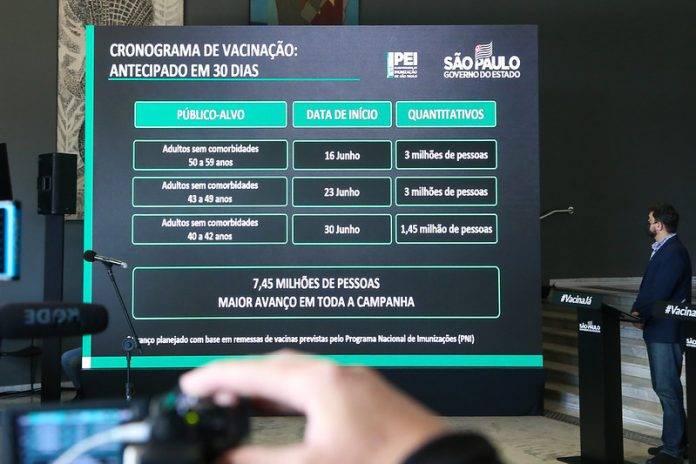 Trata-se do maior avanço já definido na campanha de vacinação contra o coronavírus em São Paulo, com doses garantidas para início da imunização dos adultos de 40 a 59 anos ainda em junho. Somente neste mês, a previsão do PEI (Programa Estadual de Imunização) é que 7,45 milhões de adultos do Estado de São Paulo recebam a primeira dose até o final deste mês.