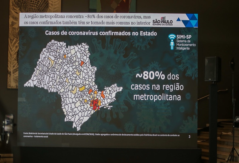 O Governador João Doria apresentou nesta quinta-feira (9) o Simi-SP (Sistema de Monitoramento Inteligente de São Paulo) para prevenção e combate ao coronavírus. A parceria com as operadoras de telefonia Vivo, Claro, Oi e TIM usa dados digitais para medir a adesão à quarentena em todo o Estado e também envia mensagens de alerta para regiões com maior incidência da COVID-19.