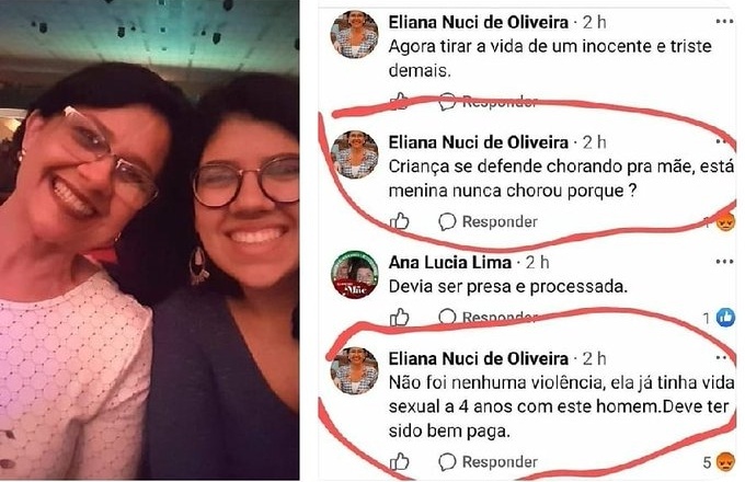 “Criança se defende chorando pra mãe, está menina nunca chorou porque? Não foi nenhuma violência, ela já tinha vida sexual há quatro anos com esse homem. Deve ter sido bem paga”, afirmou a profissional de educação básica Eliana Nuci de Oliveira, de Guarulhos, em comentário no Facebook.