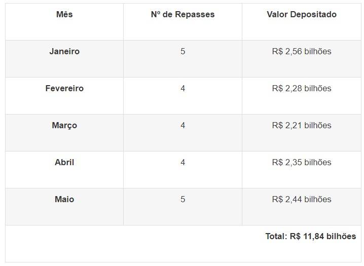 Nos primeiros cinco meses do ano, a Secretaria da Fazenda e Planejamento depositou R$ 11,84 bilhões aos municípios paulistas. Veja abaixo: