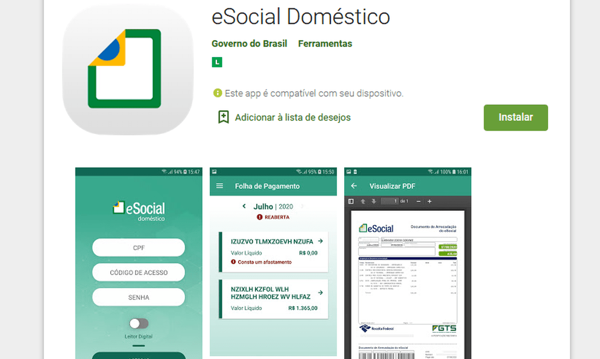 O aplicativo está disponível gratuitamente para download nas lojas da App Store e do Google Play. Para realizar o login no aplicativo, basta que o empregador utilize seu CPF, código de acesso e senha, as mesmas informações já utilizadas no site.