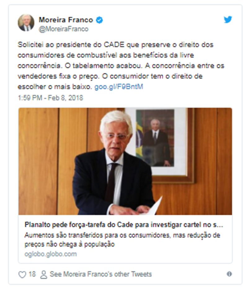 Pelo Twitter, Moreira afirmou que fez a solicitação ao Cade para que o direito dos consumidores de optar pelo menor preço de combustível seja preservado. Segundo o ministro, o tabelamento acabou.