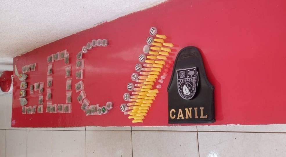 Foram apreendidas 7 pedras de crack, 51 pinos de cocaína, 11 micro-tubos de maconha, 37 invólucros de maconha e 6 tubos de haxixe.