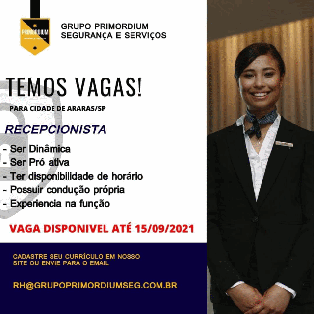O Grupo Primordium Soluções está com vagas de emprego disponíveis até o dia 15 de setembro para o município de Araras (SP). As oportunidades são para recepcionista, auxiliar de limpeza e vigia desarmado masculino.