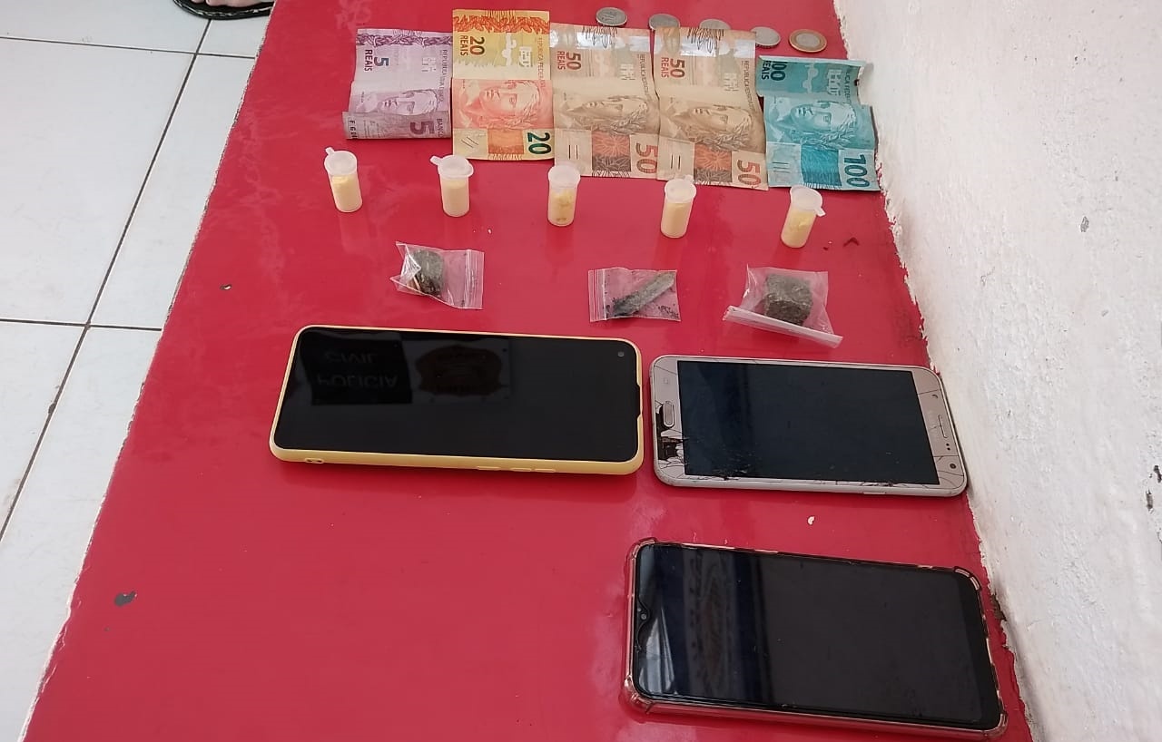 Ao avistar a equipe o mesmo dispensou cinco pinos grandes de substância aparentando ser COCAÍNA e também tentou dispensar cerca de 228,00 reais em notas diversas.