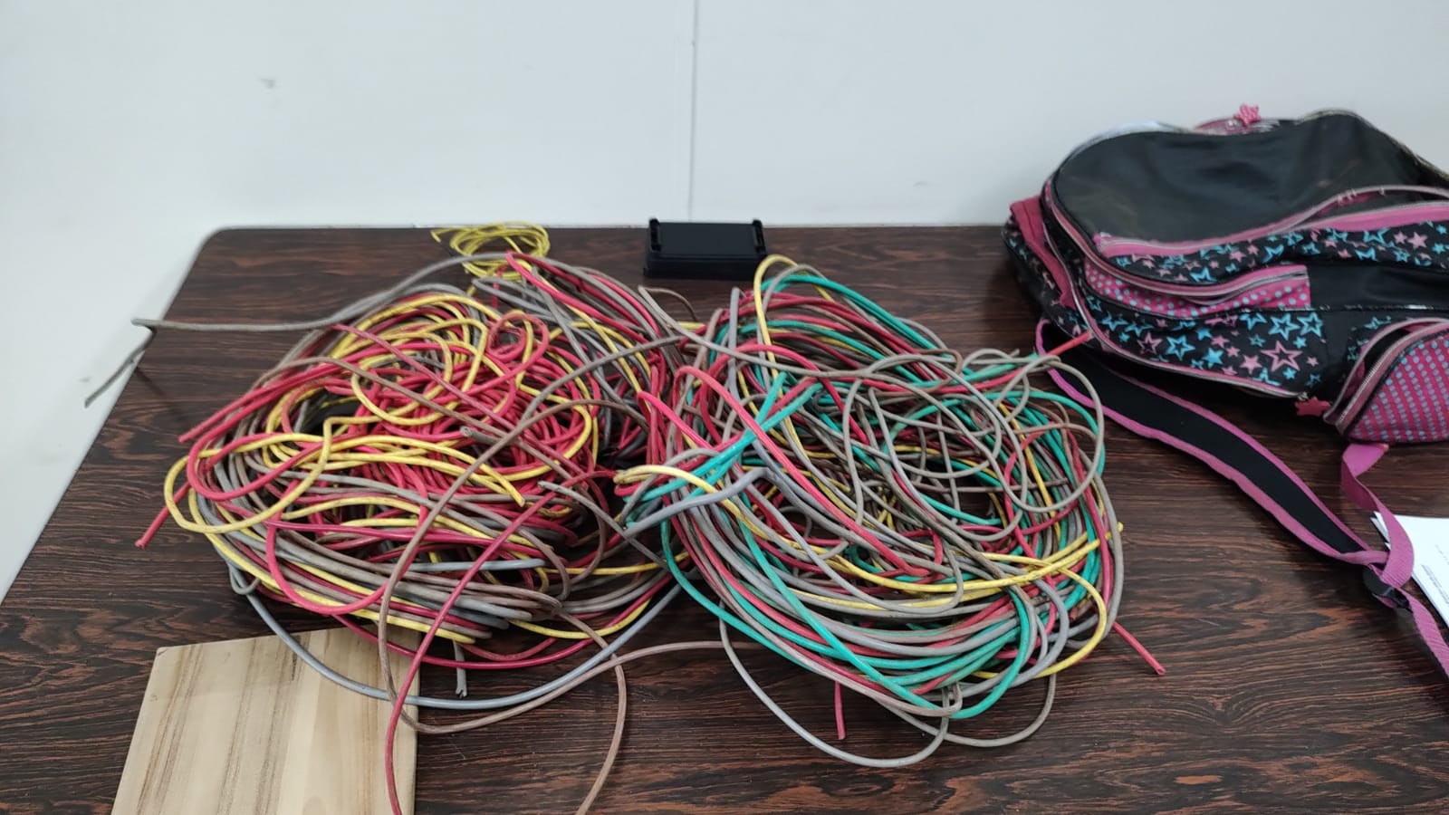 Em uma residência, em frente a Biblioteca Municipal, foram encontradas três pessoas (dois homens e uma mulher) com uma bolsa com quase 10 kilos de fios de procedência duvidosa.