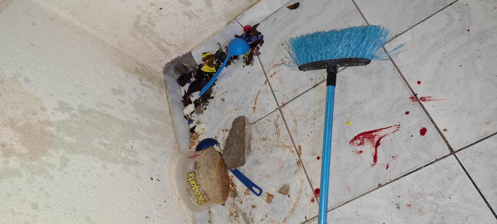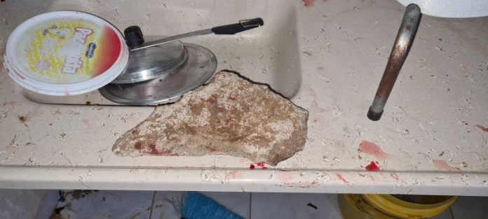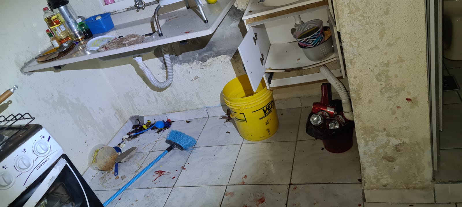 Com a chegada da equipe no local, se depararam com um indivíduo de 44 anos que apresentava escoriações na cabeça e no rosto, depois os policiais souberam que o mesmo era o autor dos fatos. Na cozinha estava a vítima, que apresentava lesão na mão direita, lesões no rosto e um corte profundo na cabeça, sendo todos os ferimentos causados por A.L.S., que mordeu a mão dela e com um pedaço de bloco de concreto atingiu sua cabeça.
