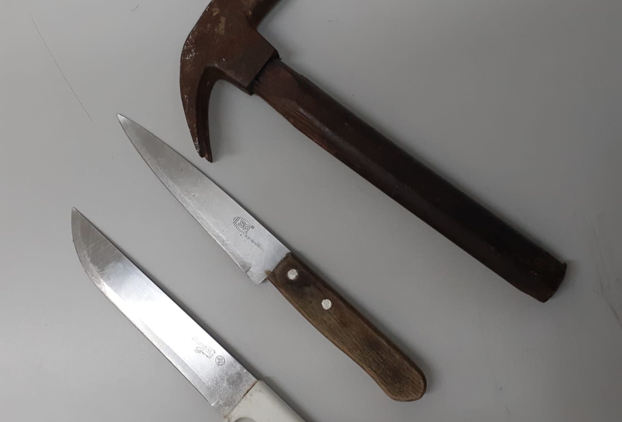 No local fizeram contato com vítima, que informou que seu amasio a agrediu com socos, chutes e marteladas, e a ameaçou de morte com duas facas. Todos os objetos foram apreendidos pela PM.