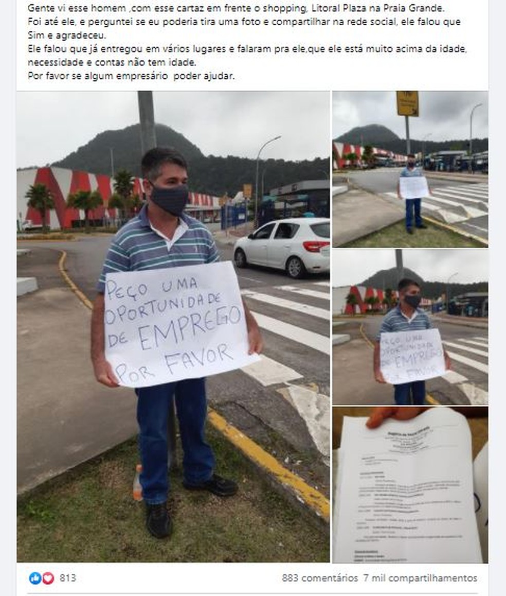 “Gente, vi esse homem com esse cartaz em frente o shopping Litoral Plaza, na Praia Grande. Fui até ele, e perguntei se eu poderia tira uma foto e compartilhar na rede social, ele falou que sim e agradeceu. Ele falou que já entregou em vários lugares e falaram pra ele que ele está muito acima da idade. Por favor, se algum empresário puder ajudar”, afirma a mulher na publicação.